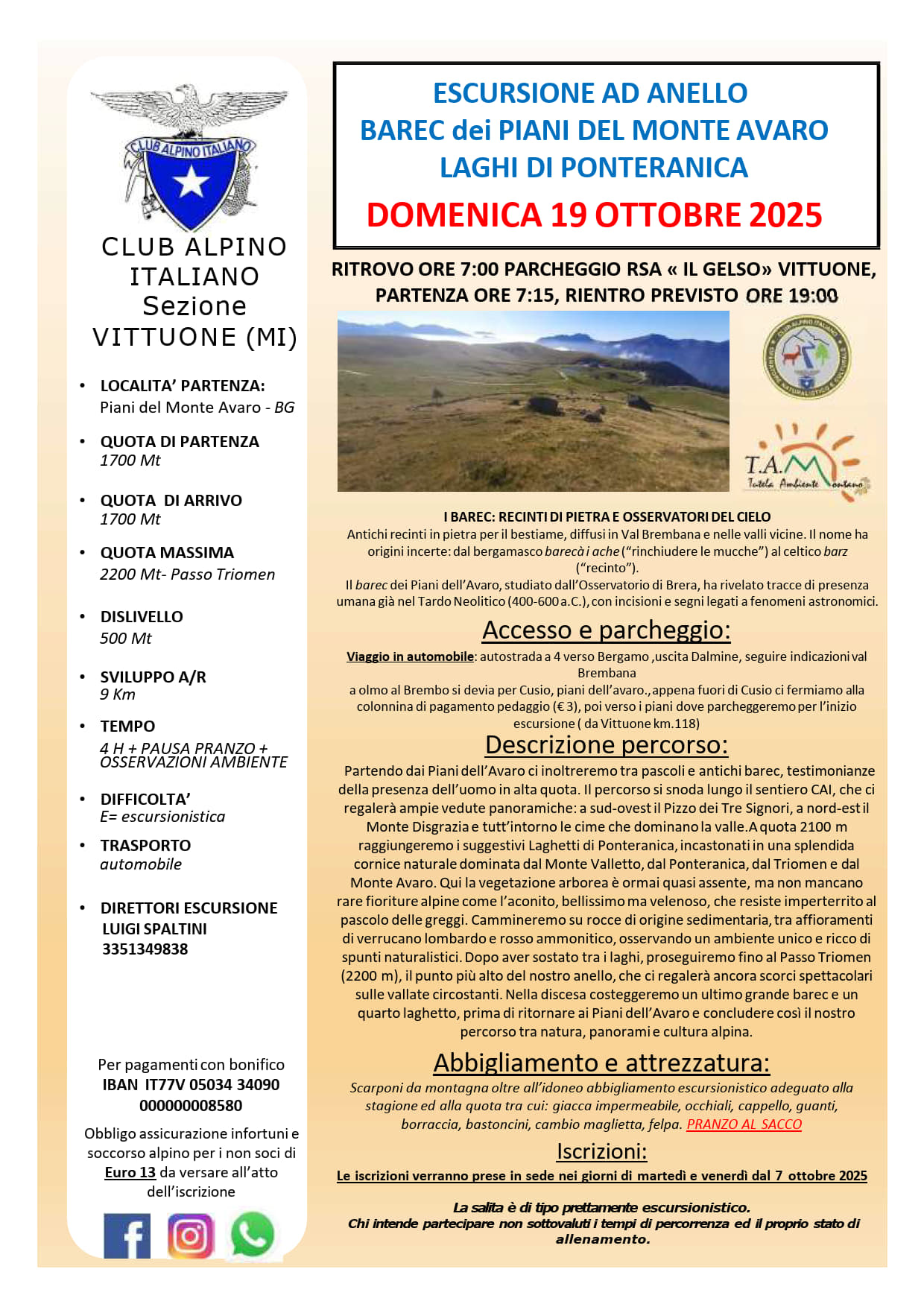 DOMENICA 19 OTTOBRE 2025 ESCURSIONE AD ANELLO BAREC dei PIANI DEL MONTE AVARO LAGHI DI PONTERANICA