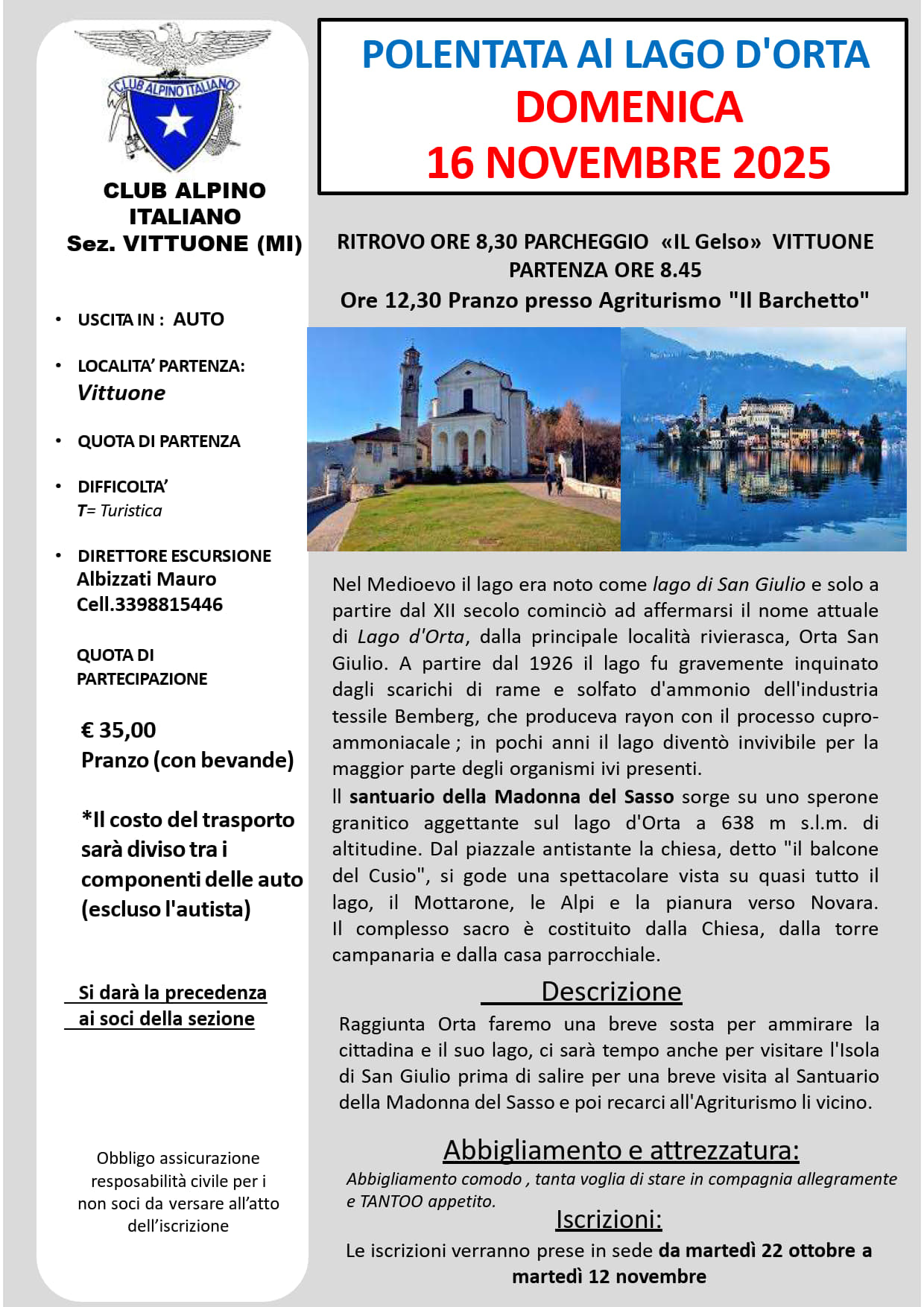 DOMENICA 16 NOVEMBRE 2025 POLENTATA Al LAGO D'ORTA